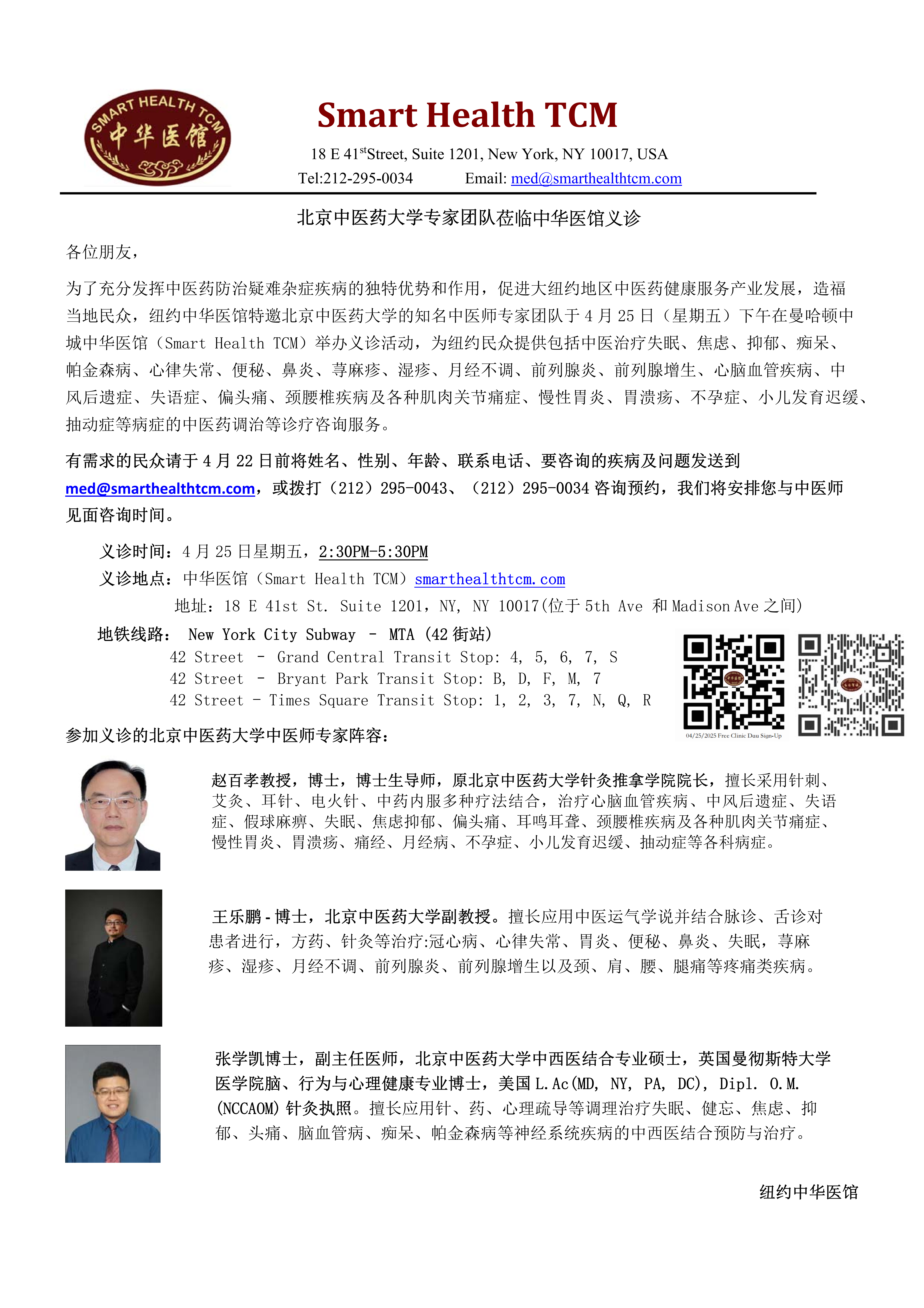 有意参加义诊者需在4月22日前发送姓名、性别、年龄、联系电话及所咨询的健康问题至邮箱:med@smarthealthtcm.com,或拨打电话:(212)295-0043 / (212)295-0034进行预约登记。
