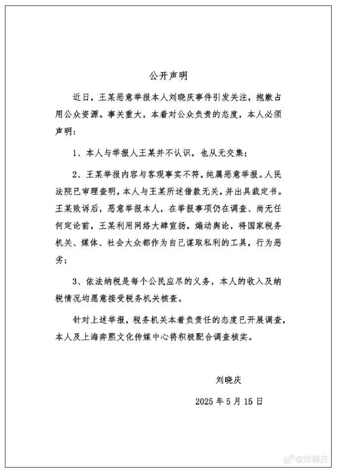 5月15日晚,刘晓庆发布公开声明:本人与举报人王某并不认识,也从无交集。王某举报内容与客观事实不符,纯属恶意举报。