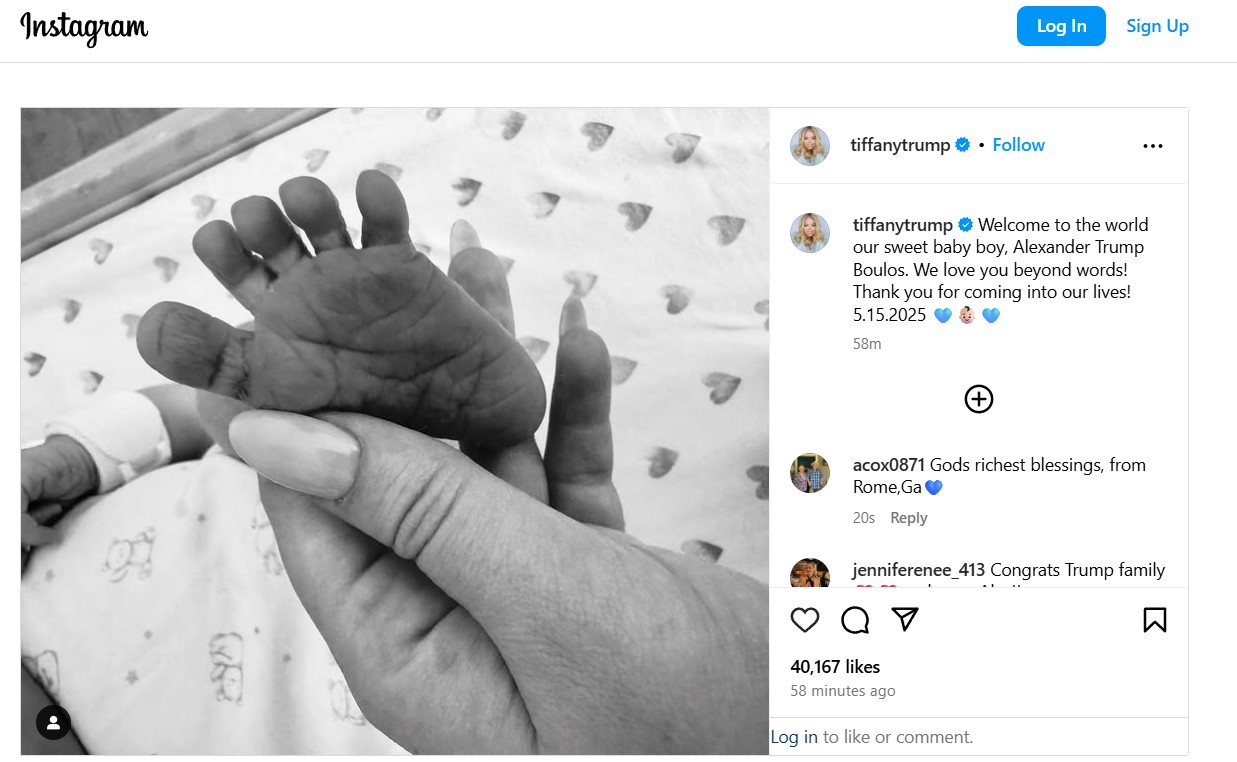 蒂芙尼在Instagram上欣喜地宣布:“欢迎来到这个世界,我们可爱的宝贝儿子,亚历山大·川普·布罗斯。我们爱你无以言表!感谢你走进我们的生活!5.15.2025。”她附上了一张抓着婴儿小脚的黑白照片。